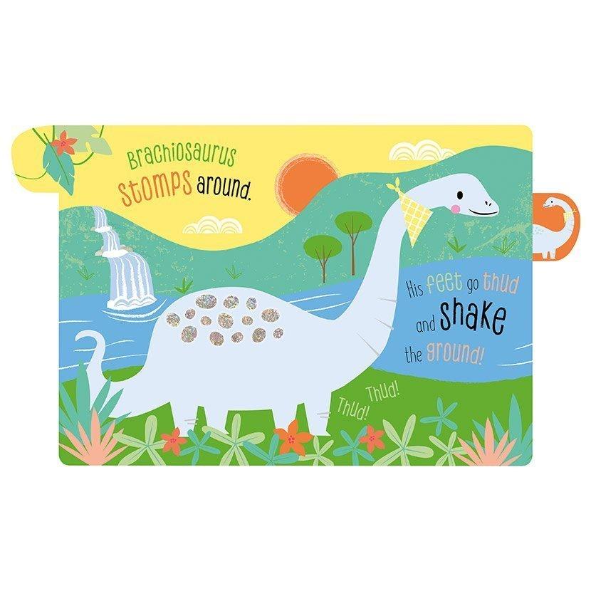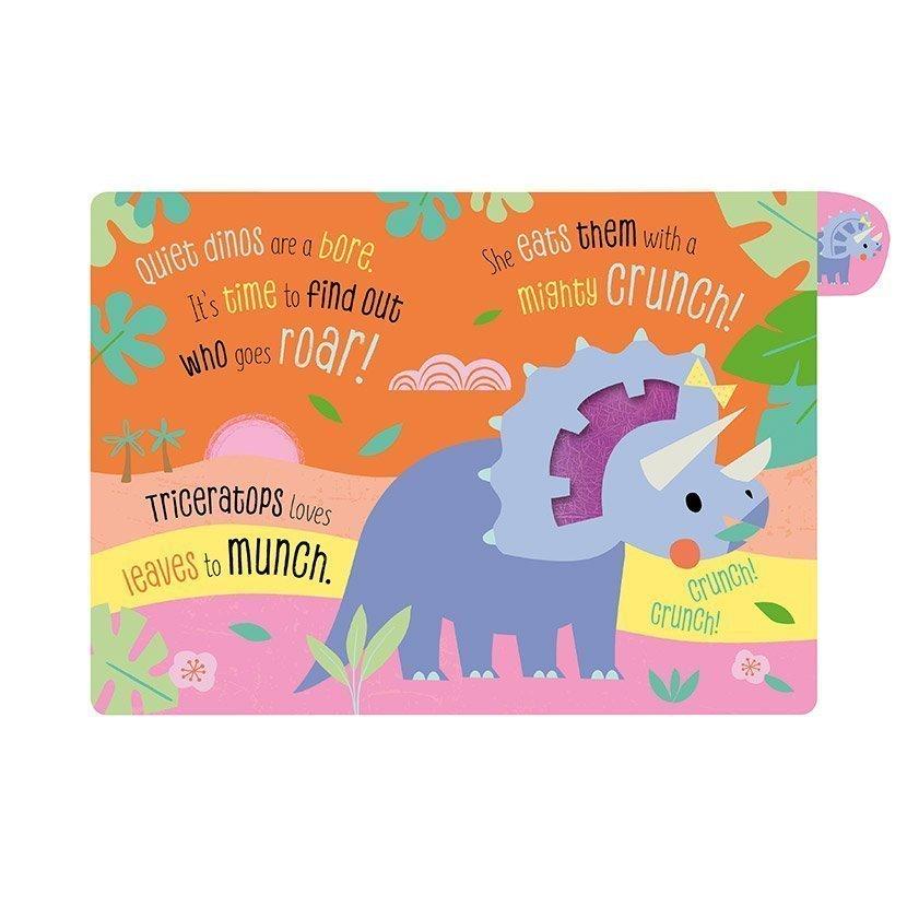 - A dinosaur-themed board book with five shaped tabs perfect for little hands to explore!