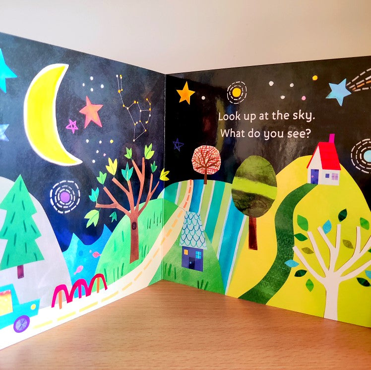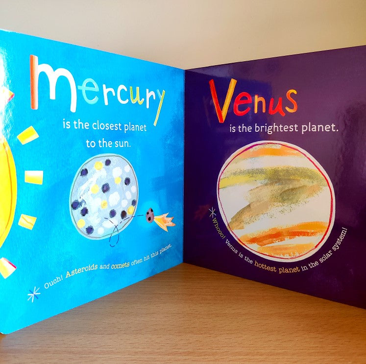 Every young child loves to look up at the moon in the night sky. Now here's a book that can teach toddlers about the sun, moon, stars, and planets - with colors, shapes, sizes, and super-simple facts ("Can you point to the red planet? That's Mars!"). It's a perfect way to bring natural science into the busy world of a toddler, where learning never stops.