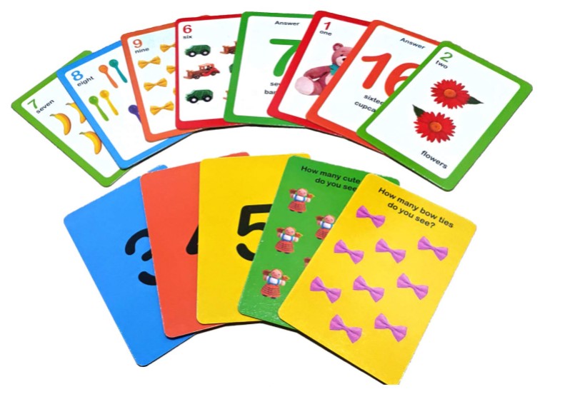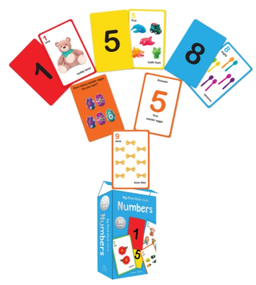 A box of 30 flash cards to introduce pre-schoolers to numbers. The flash cards are filled with vibrant images and world labels, followed by questions and answer for revision.