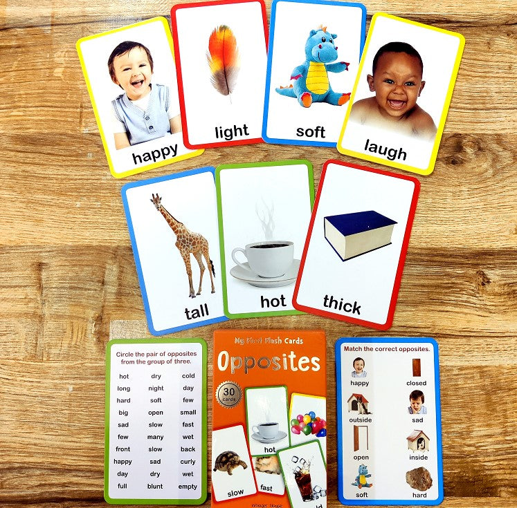 A box of 30 flash cards to introduce preschoolers to opposites. The flash cards are filled with vibrant images and word labels, followed by questions and answers for revision.