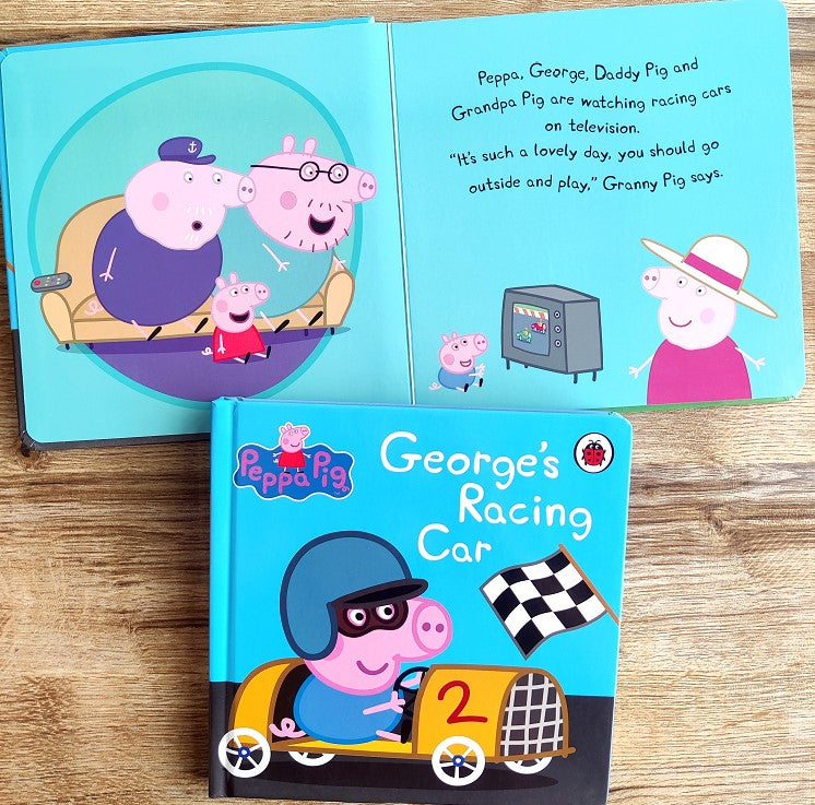 Peppa and George are inside watching television on a sunny day when Granny Pig sends them outside to play. Grandpa Pig builds George his very own pedal car and Peppa and George soon discover that real life racing is better than watching it on television!