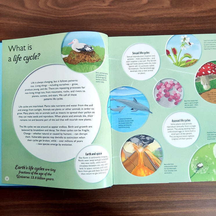 Everything has a beginning and an end, but what happens in between? Follow the migration of zebra across the vast plains, meet penguins guarding their eggs on the ice, and watch butterflies emerge from their cocoons. Shoot back in time 4.5 billion years to see how planet Earth was formed and then leap into the future to see what happens when stars die. Discover a new life cycle every time you turn the page.