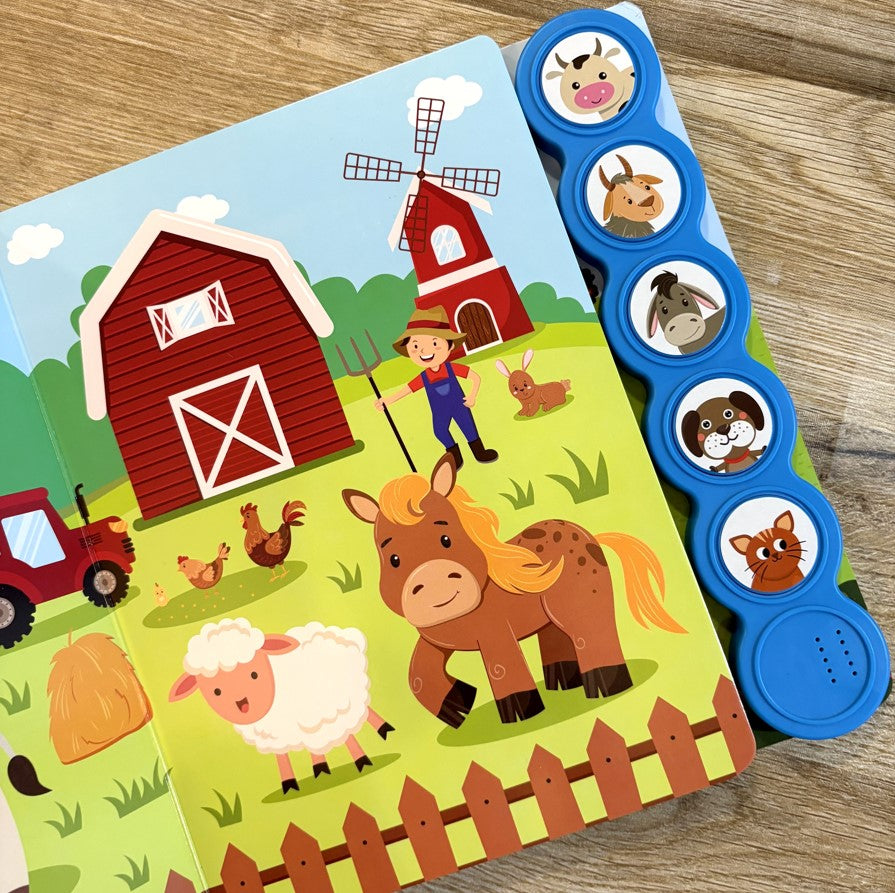 This Farm Animals Sound Book for Kids features 5 sound buttons that allow children to hear authentic farm animal noises. Designed to be engaging and interactive, it supports early learning and development through playful sound exploration.