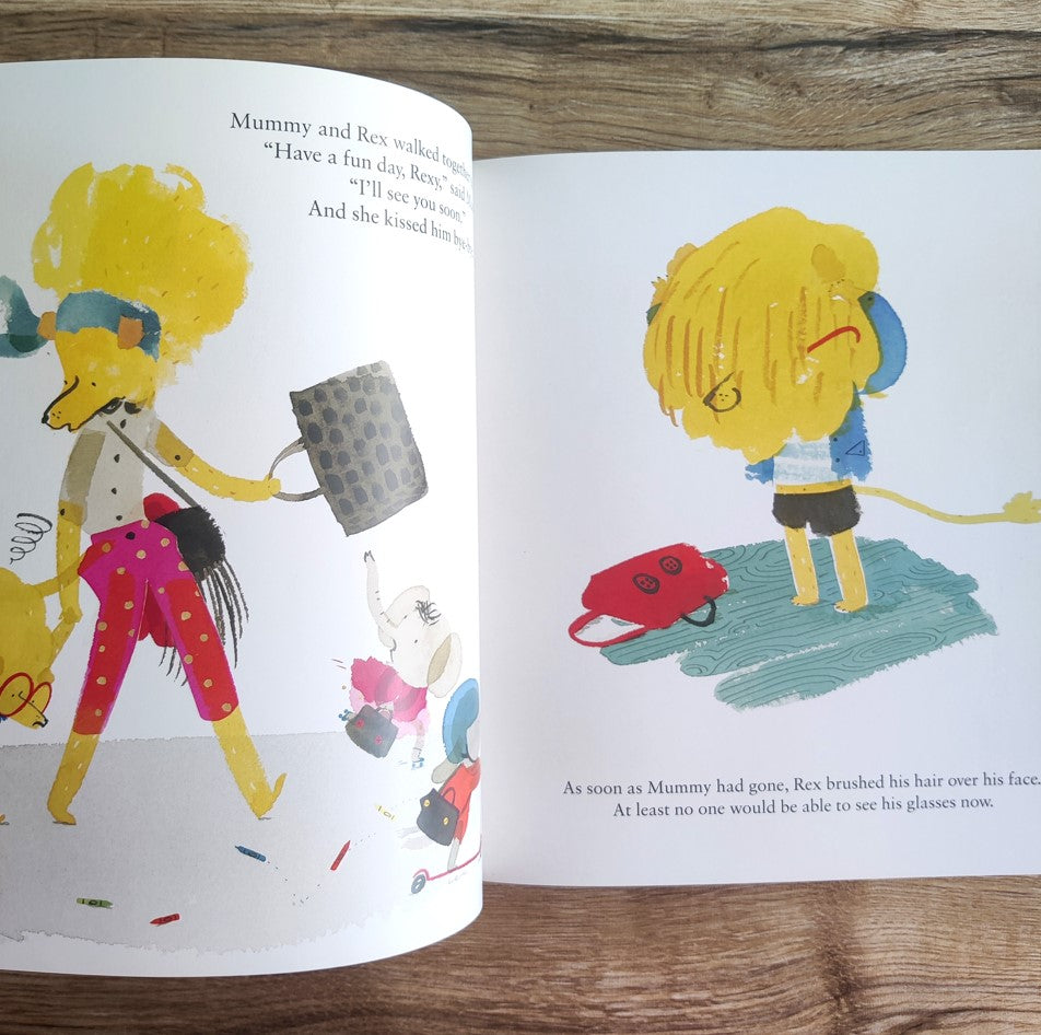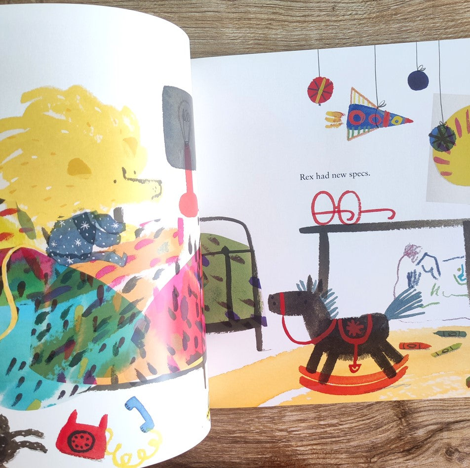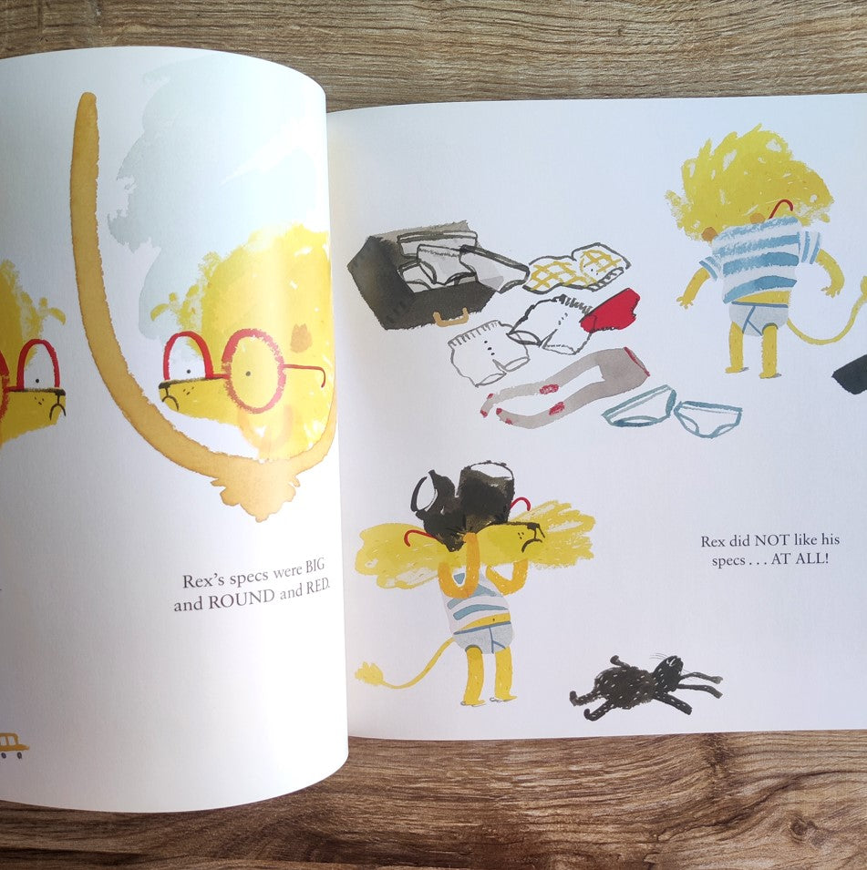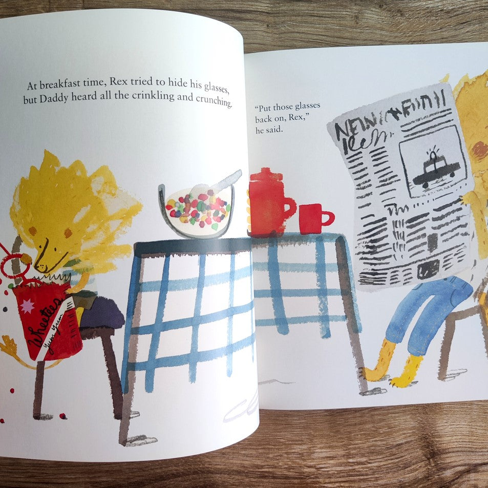 Rex has new glasses and he HATES them! He does NOT want to wear them to school, and he tries to hide them - in the strangest places! But it's pretty tricky hiding specs that are so big, and round and RED . . .
