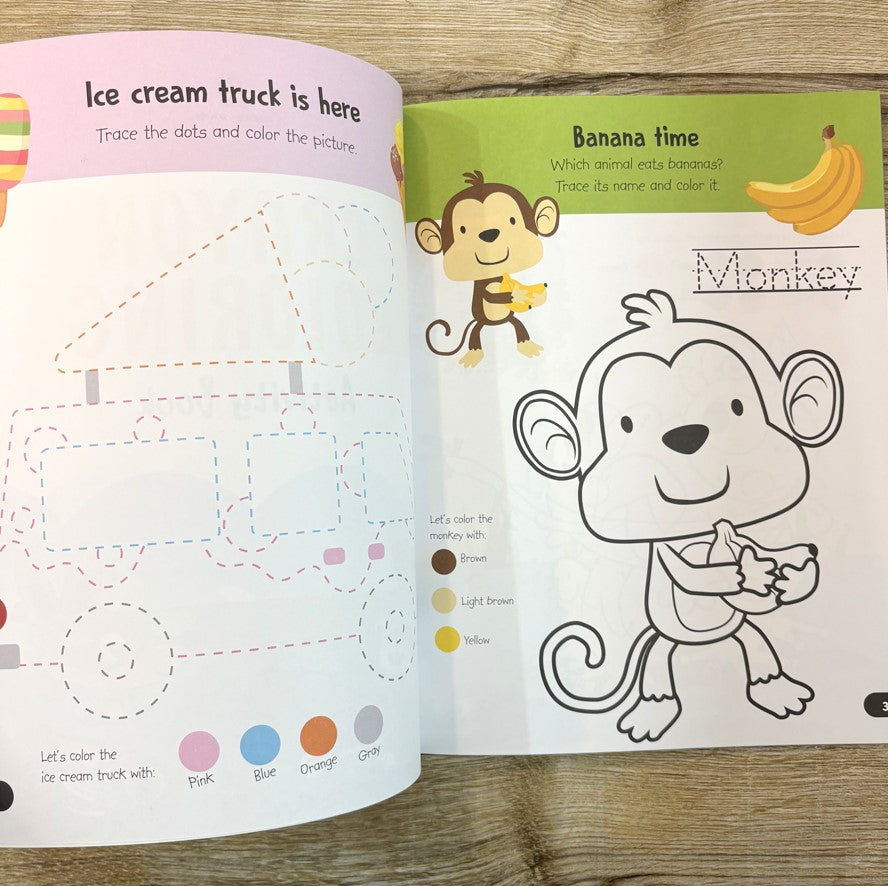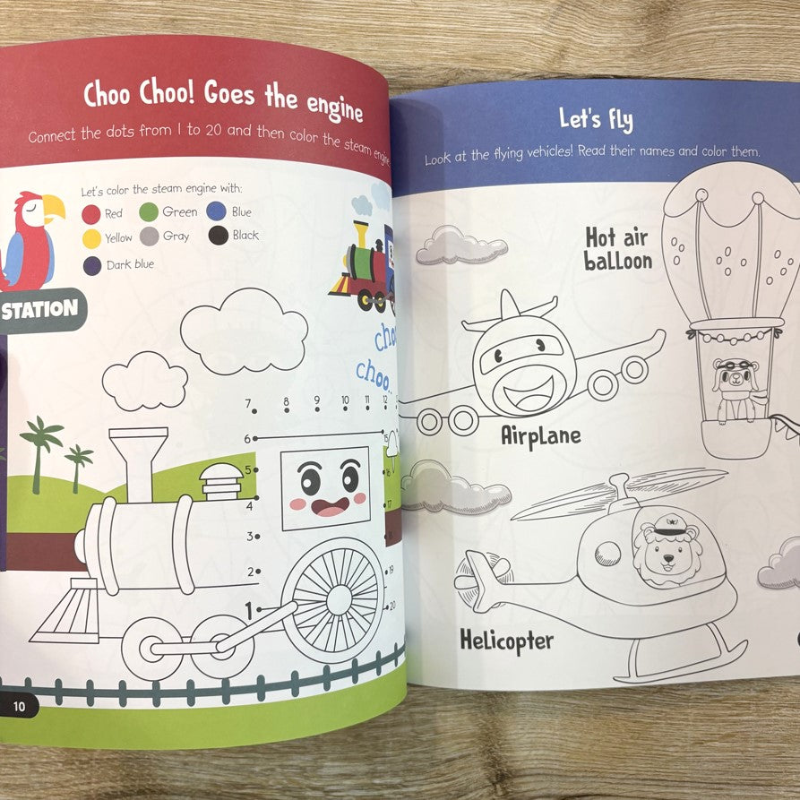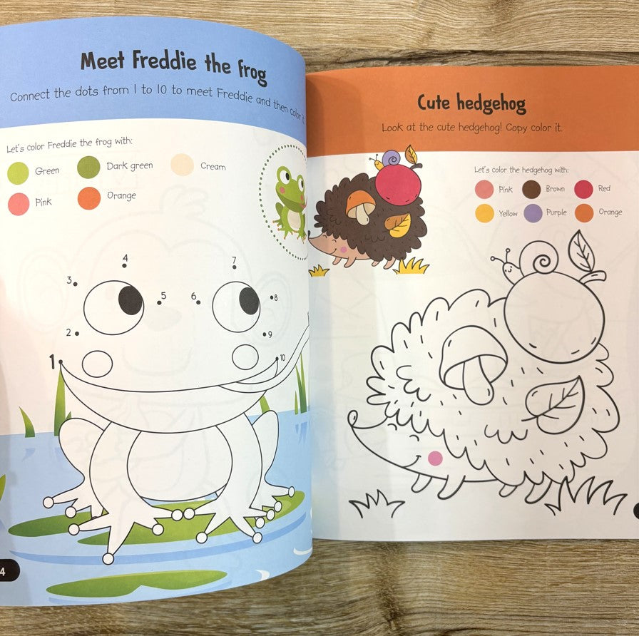 A fun-packed book with oodles of coloring activities like copy-coloring, dot-to-dot coloring, and number coloring.