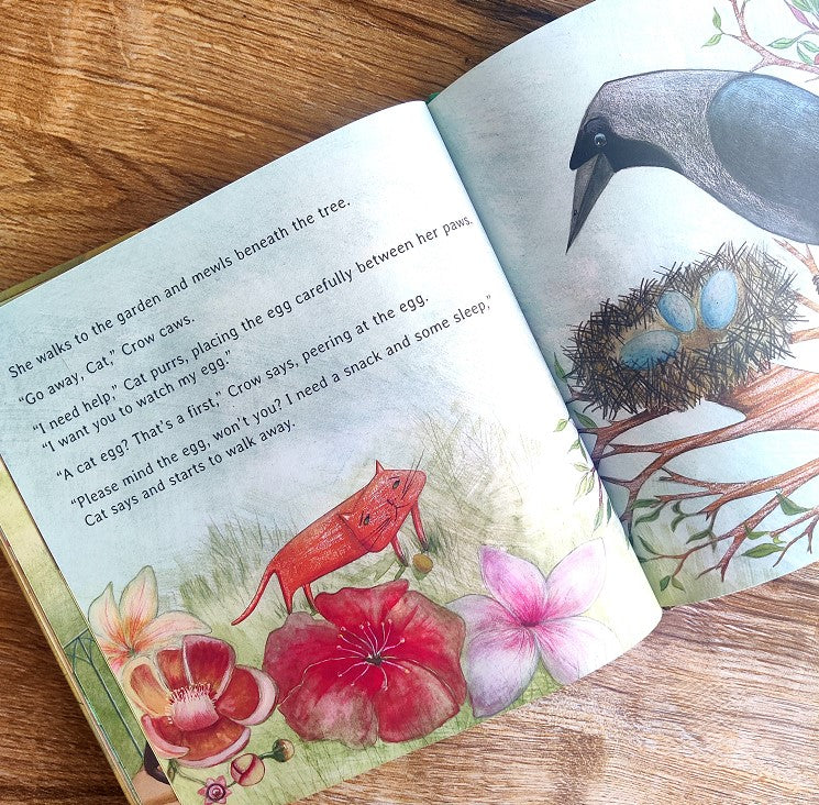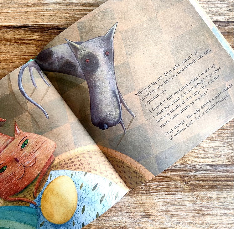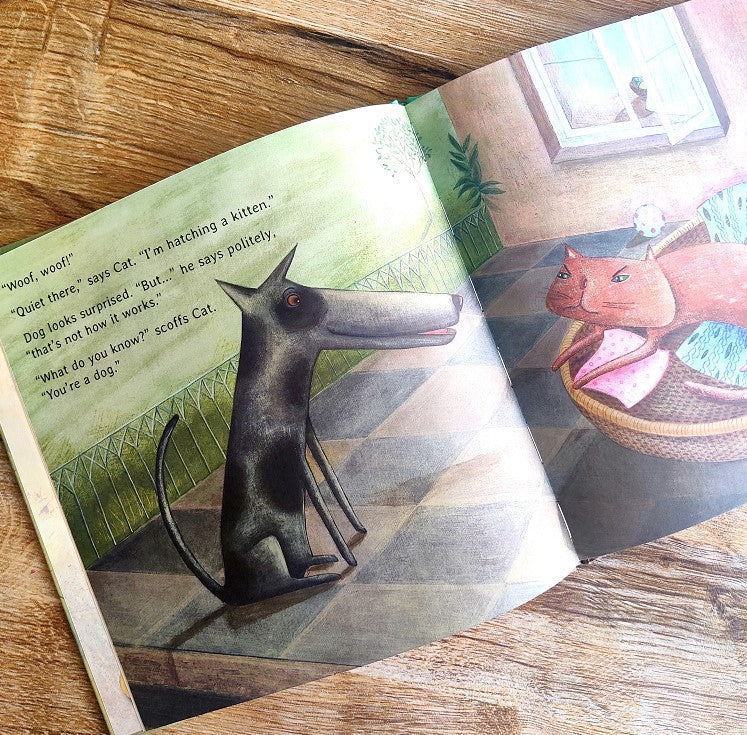 How long does it take to hatch a kitten? Cat isn't sure, but she would rather be snacking or napping. Join her as she looks around for a babysitter for her mysterious golden egg. She seeks help from her baffled friend Dog, a crow, a cuckoo, and a turtle, for as we all know, it takes a village to raise an egg.
