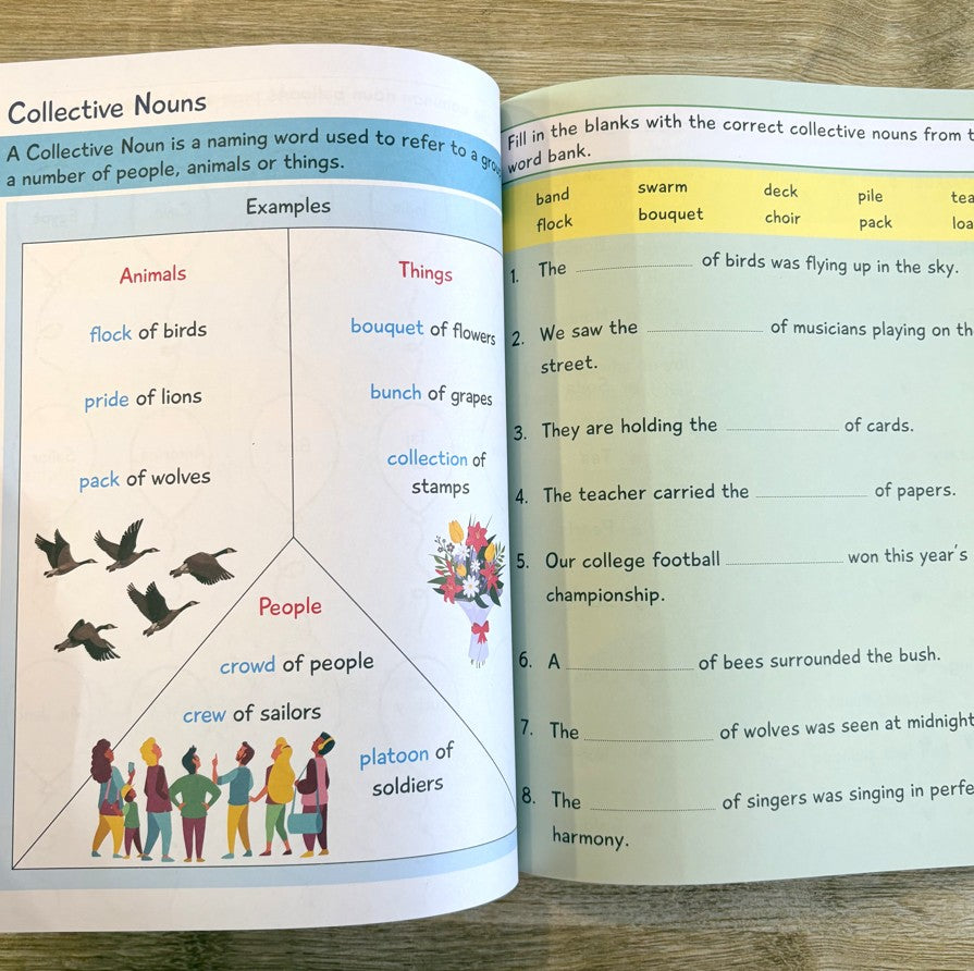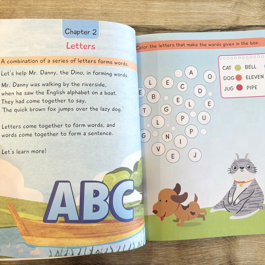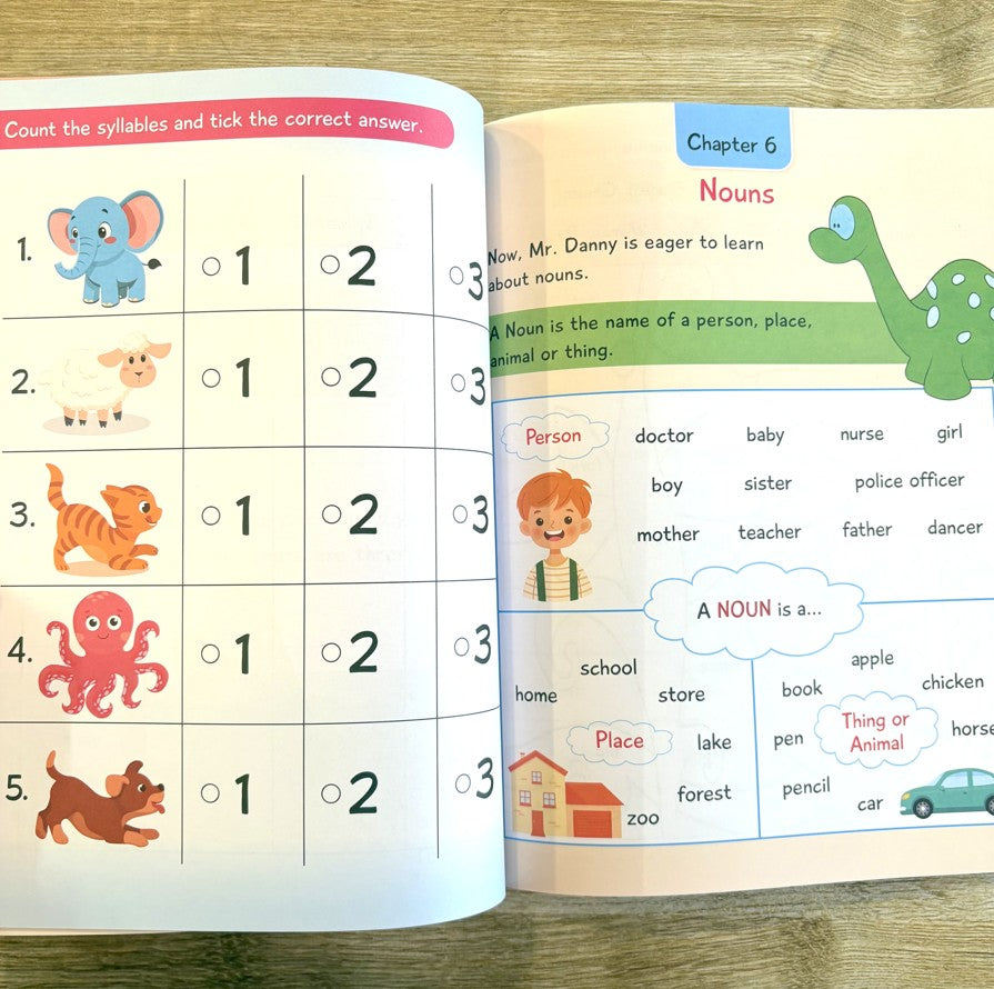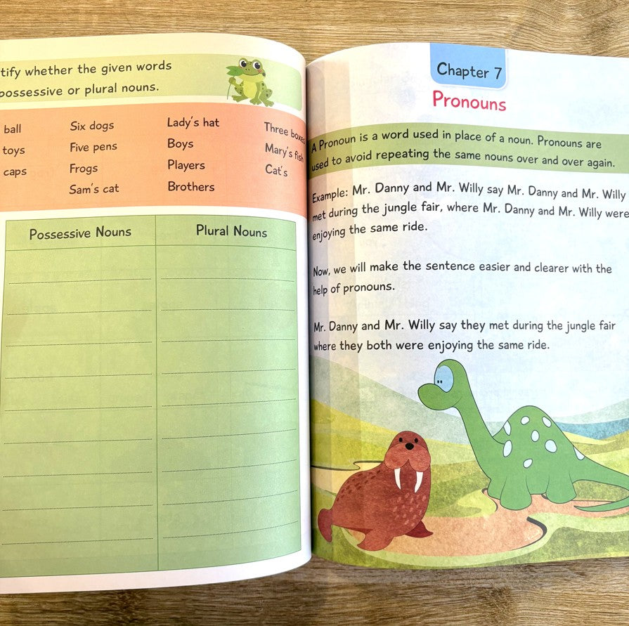 Level 1 lays the groundwork for essential grammar understanding in a fun and accessible way. With charming mascots like Mr. Danny the Dino and Mr. Willy the Walrus, this book covers early grammar concepts such as nouns, verbs, adjectives, subject-predicate, and sentence building using games, rhymes, colouring activities, and picture-based prompts.