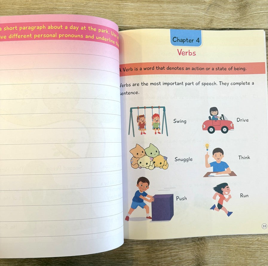 Level 2 expands on core grammar with a focus on sentence construction, word function, punctuation, and tense recognition. Children explore grammar in action with dialogue prompts, rule boxes, and themed writing exercises. The language is simple, examples relatable, and illustrations supportive of every concept.