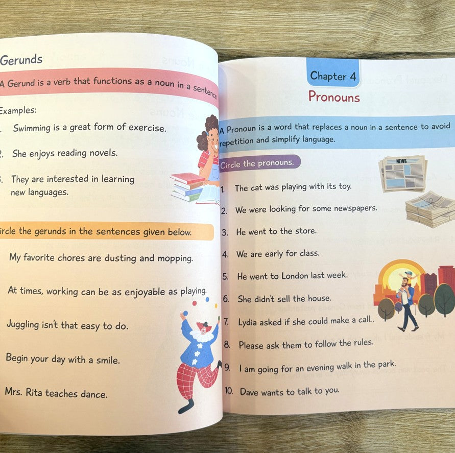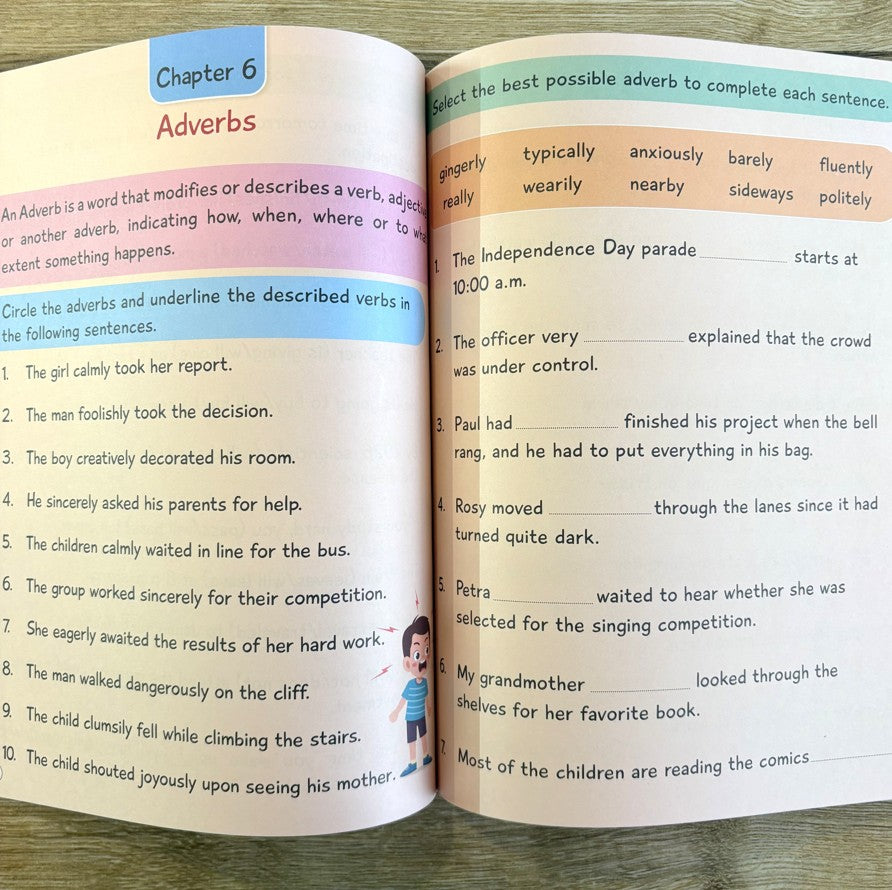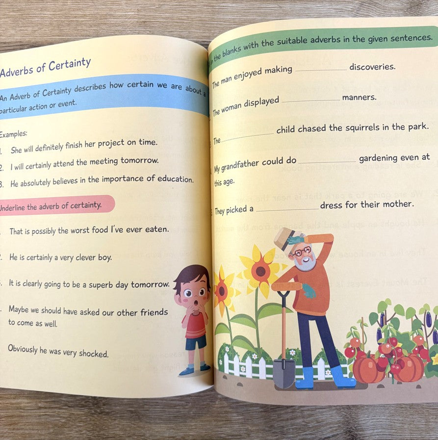 Level 4 concludes the series with advanced grammar essentials needed for academic writing and formal language use. Topics include modal verbs, conjunctions, compound and complex sentences, prefix/suffix vocabulary building, and sentence editing. It promotes clear expression, writing discipline, and readiness for middle-grade grammar expectations.