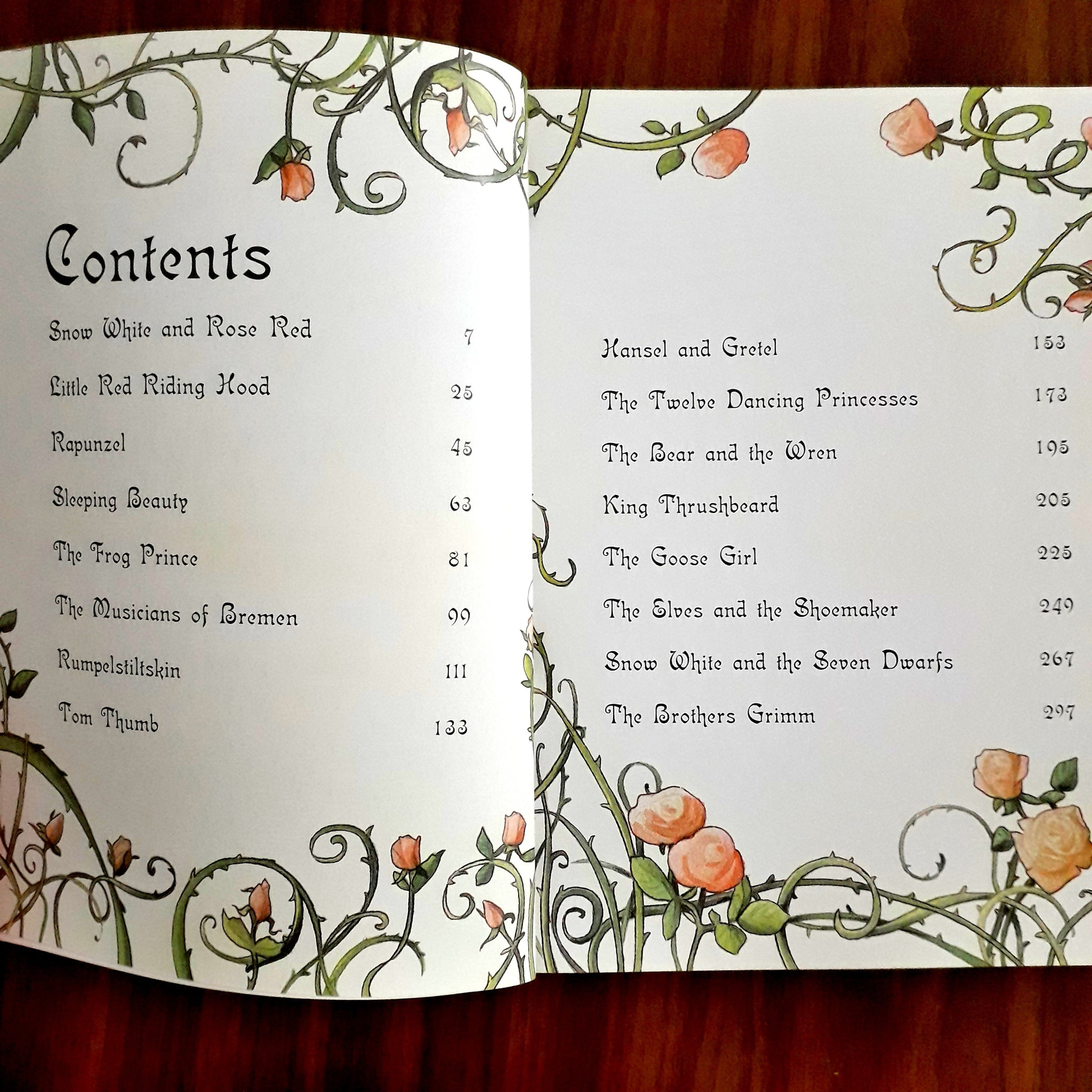 Include well-known stories such as “Hansel and Gretel”, “Sleeping Beauty”, “Rumpelstiltskin”, “Tom Thumb” and “The Frog Prince” as well as a short biography of the brothers themselves.