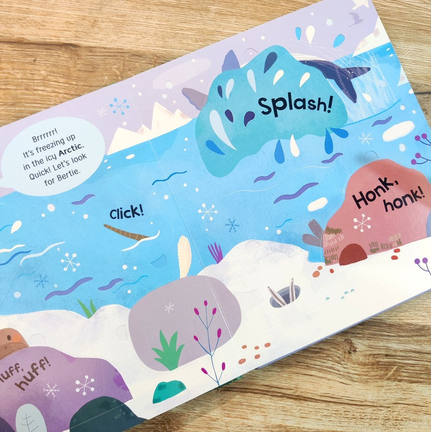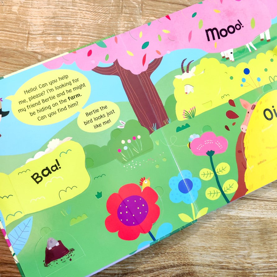 Little Bird is flying all around the world looking for her friend, Bertie. Can you help her find him? With lots of flaps for curious hands to lift and 50 amazing animals to meet. From muddy piglets on the farm to slithering snakes in the jungle, visit incredible places and learn new words as you search. Endearing illustrations and sturdy flaps will make this a treasured book to revisit again and again.