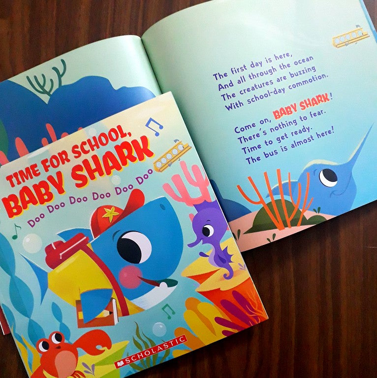 What does Baby Shark do at school? Story time! Doo doo doo doo doo doo!Sing a song! Doo doo doo doo doo doo!Make a friend! Doo doo doo doo doo doo!Play all day! Sing, dance, and read along to this brand-new school-themed song, featuring Baby Shark and his underwater friends. Perfect for back-to-school and all throughout the year, kids and caregivers alike will delight in this silly illustrated story, full of funny, eye-popping illustrations and a catchy tune you won't be able to stop singing. Also features helpful picture guides so readers can dance along, act out the hand and foot movements, and develop their fine motor skills. Snuggle up with your little one and as you laugh, sing, and dance along to this charming and catchy read-aloud!