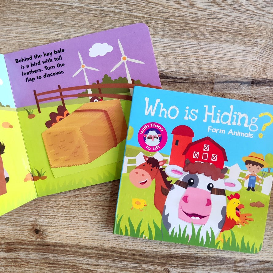 "Who Is Hiding - Farm Animals Board Books" captivate young readers with charming illustrations and interactive surprises. Each sturdy page showcases scenes from the farm, bustling with activity and filled with adorable farm animals.